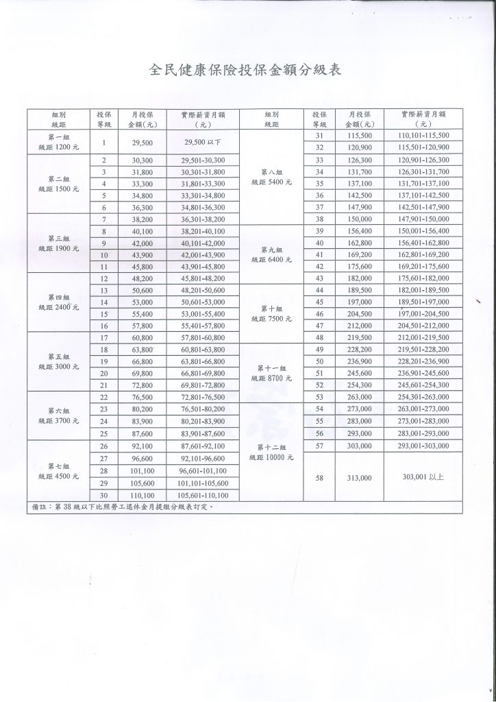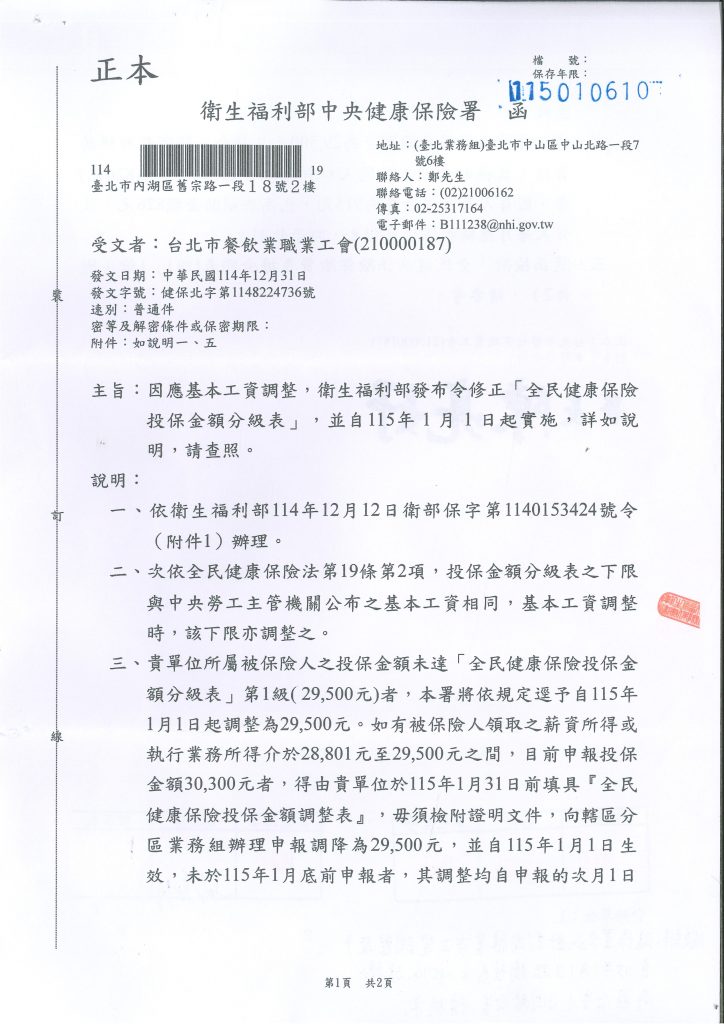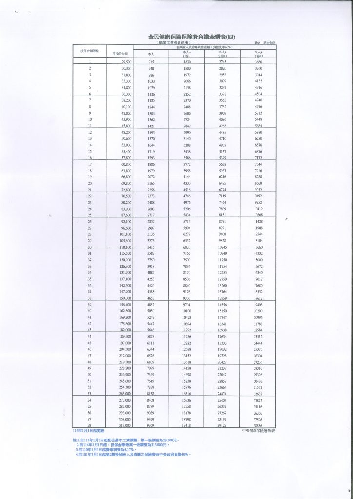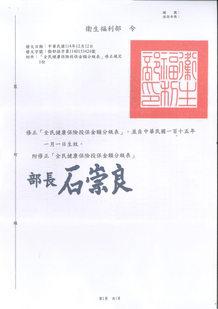 【健保】因應基本工資調整,衛生福利部發布令修正「全民健康保險金額分級表」,自115年1月1日實施。